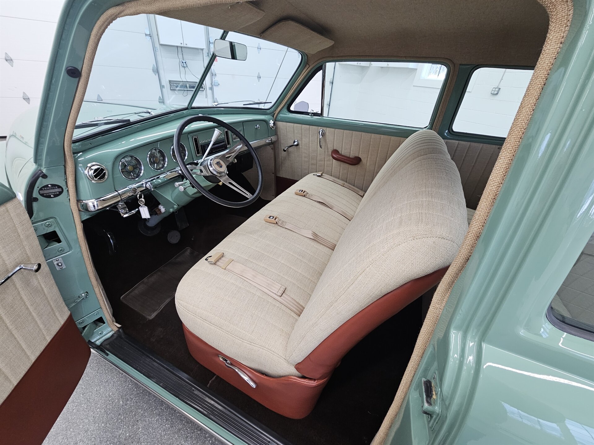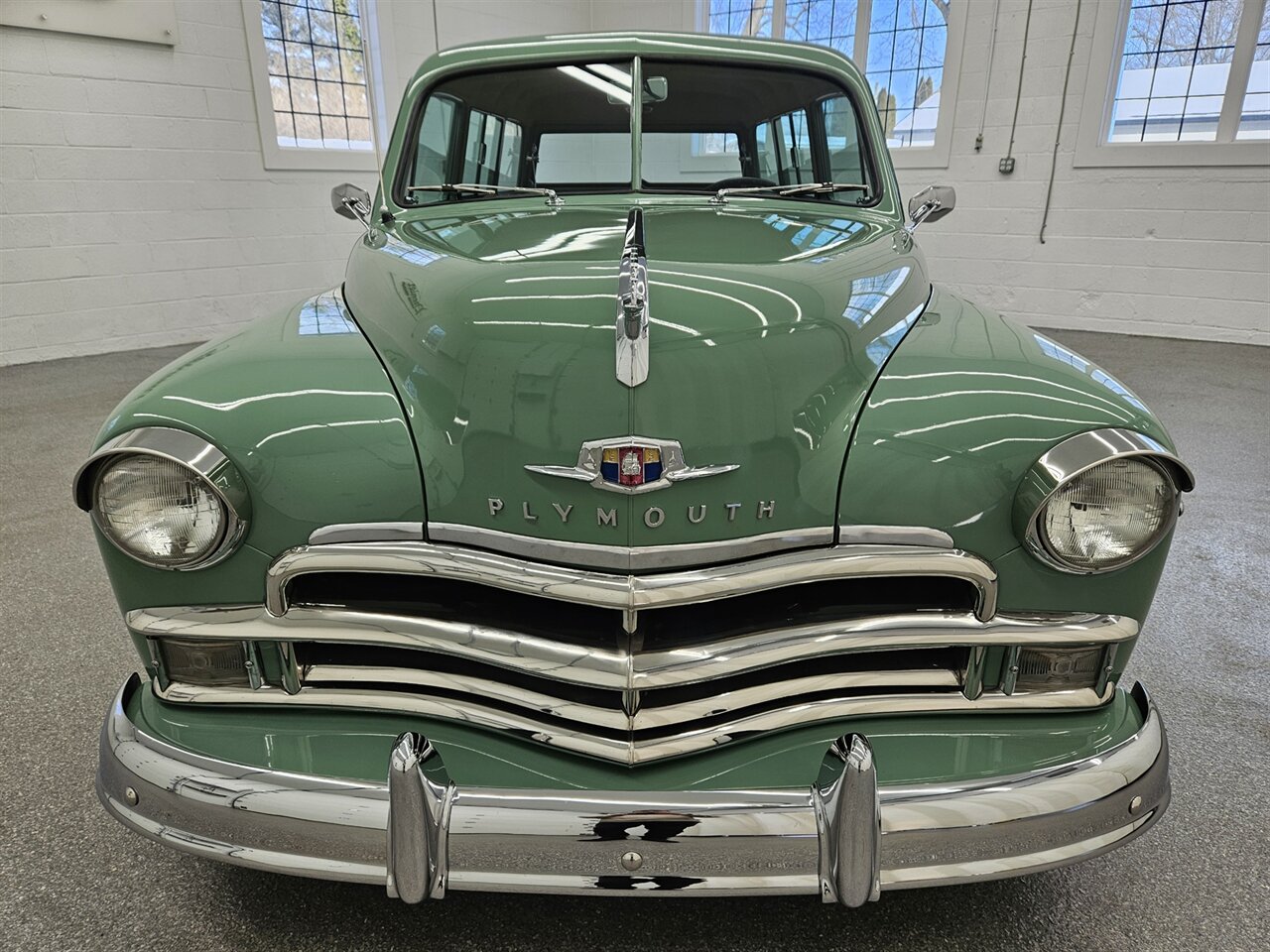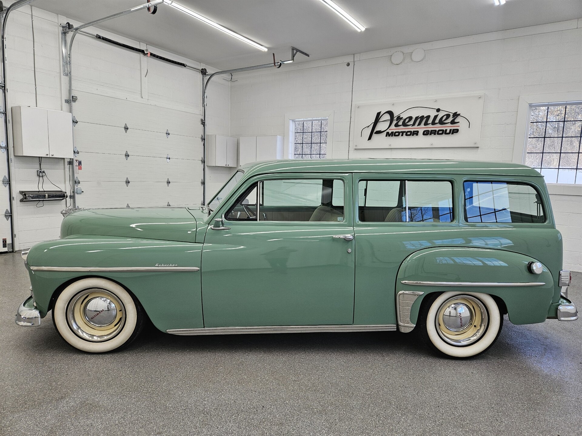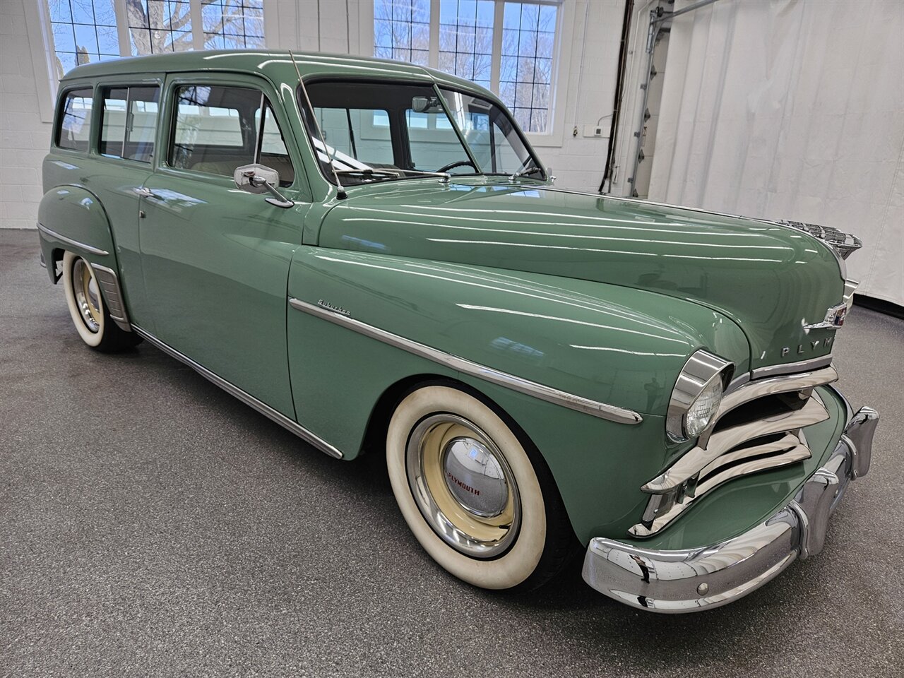 You are viewing a beautiful 1950 Plymouth Deluxe Suburban that has been thoughtfully updated while still retaining its classic character. Finished in an attractive green exterior over a white tweed and brown interior, this Suburban presents a timeless and eye-catching look. Under the hood, it is powered by a Chevy 350 V8 engine paired with a TH350 automatic transmission, offering strong, reliable performance along with modern drivability. Comfort and handling have been enhanced with power rack-and-pinion steering, power front disc brakes, a 9" rear axle, and air conditioning, making this classic enjoyable for both cruising and longer drives. Additional features include tilt steering, a Kenwood stereo system, folding rear seat, sliding side windows, 15" steel wheels, and wide whitewall tires that complete the vintage appearance. This Plymouth runs great, drives smoothly, and consistently turns heads wherever it goes. Contact us today to schedule your test drive and experience this unique blend of classic style and modern upgrades for yourself.