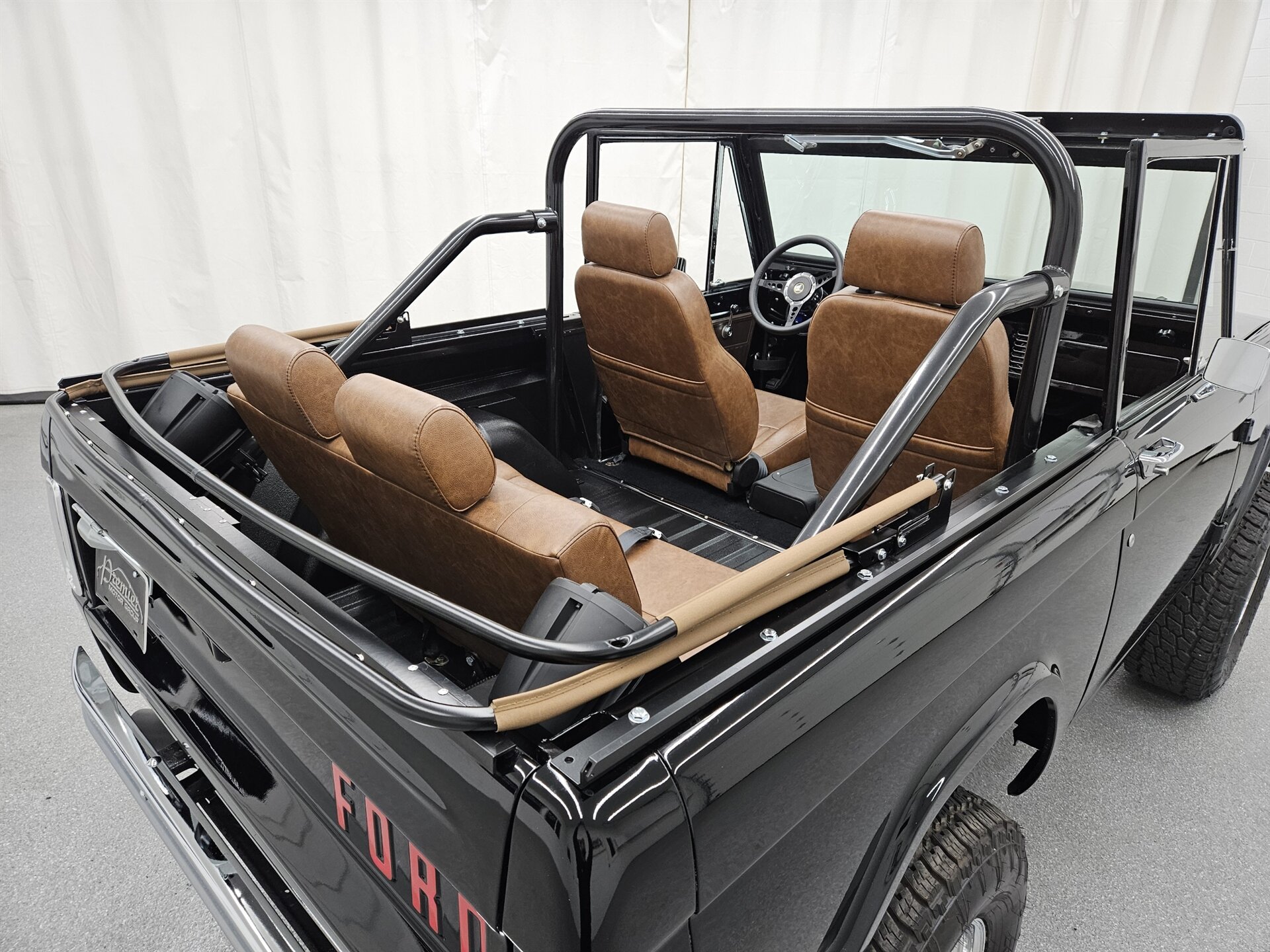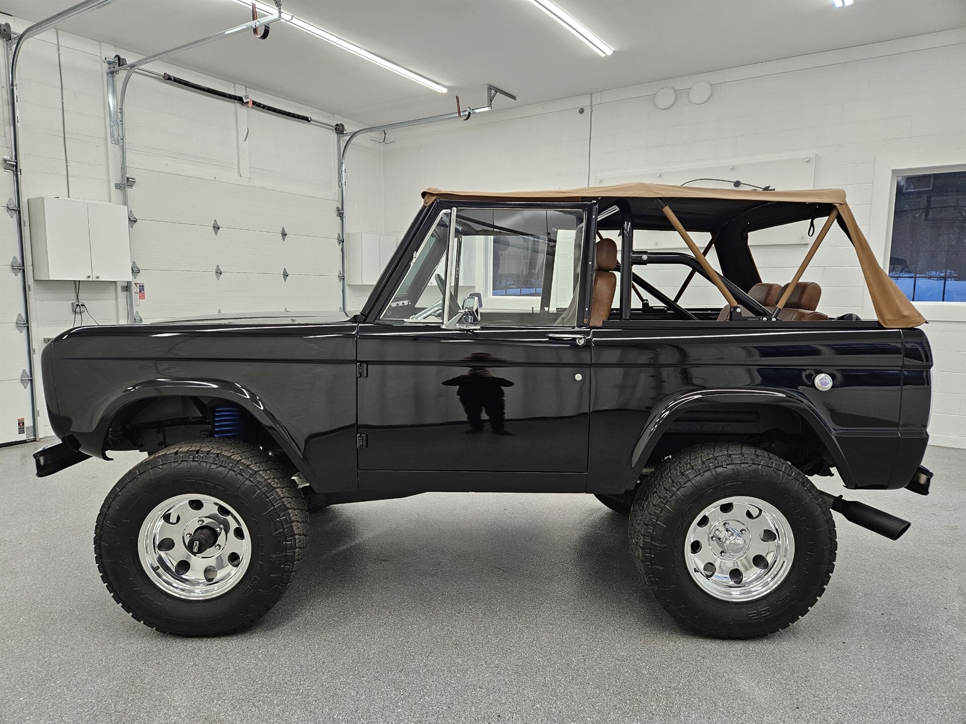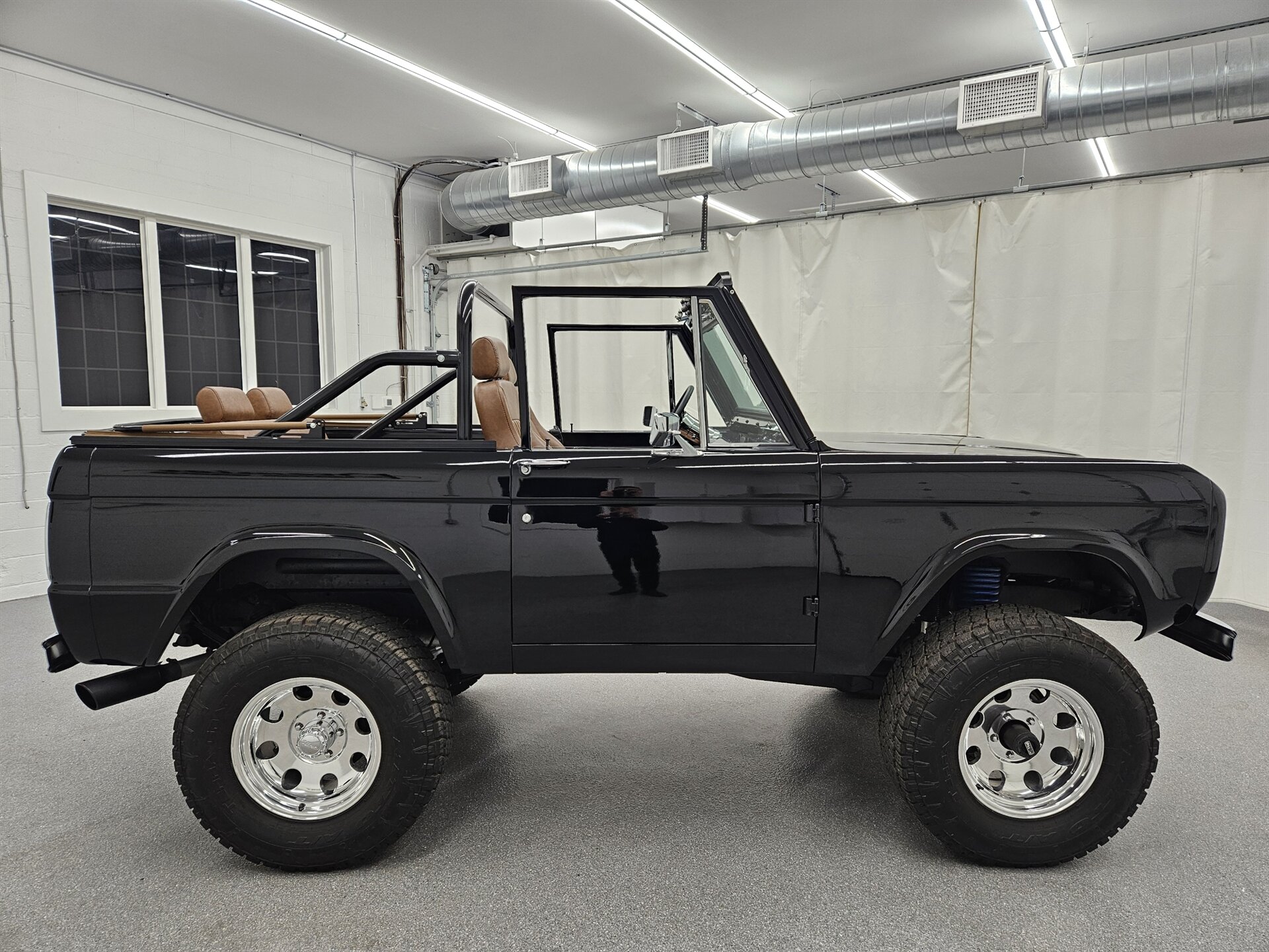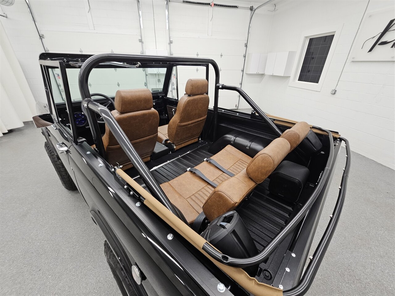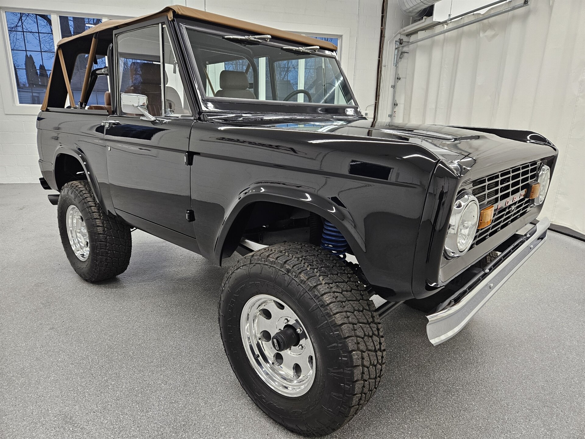 This 1969 Ford Bronco is a stunning marriage of classic aesthetics and modern performance, presented in a striking high-gloss black exterior over a deep walnut brown vinyl interior. Under the hood, the build is powered by a potent Blueprint 347 stroker engine featuring a Holley Sniper fuel injection system, paired with a C4 automatic transmission and a precision Sidewinder shifter. The cabin is thoughtfully appointed with a polished tilt steering column, a digital gauge display, and a premium saddle brown soft top. This Bronco commands a powerful presence on the road thanks to a 4-inch suspension lift with Bilstein shocks, sitting perfectly on 17-inch Ultra Wheels wrapped in aggressive all-terrain tires. Contact us to schedule your test drive today!