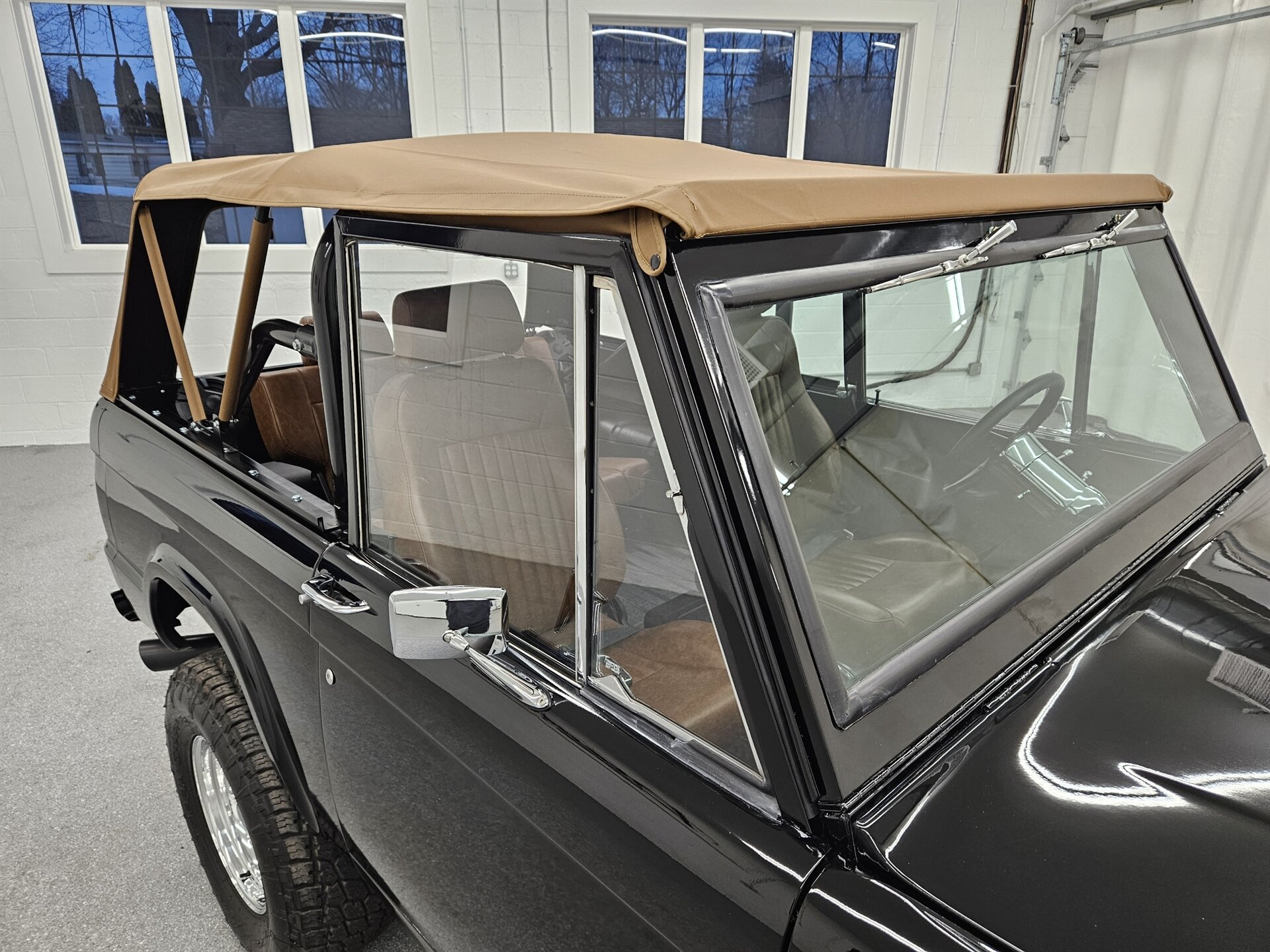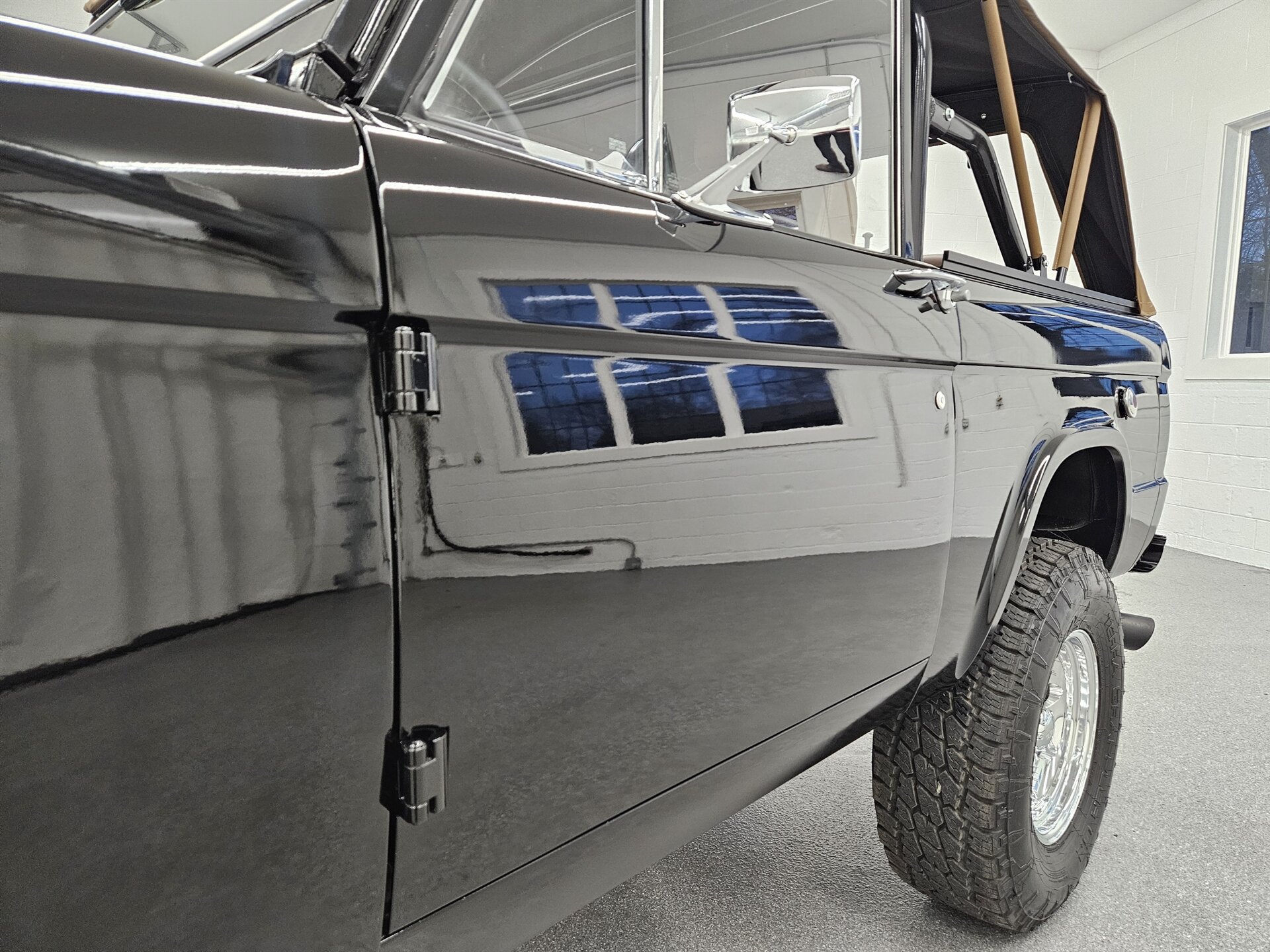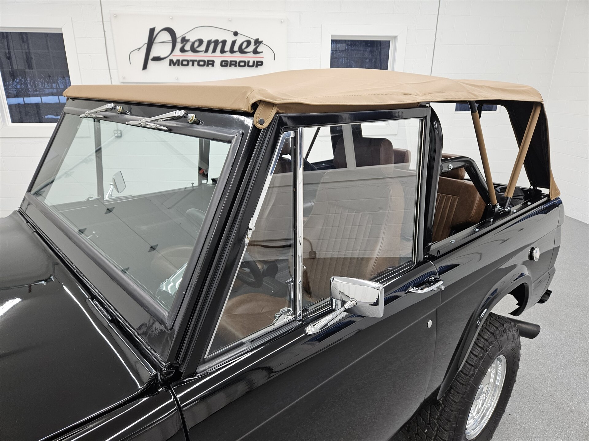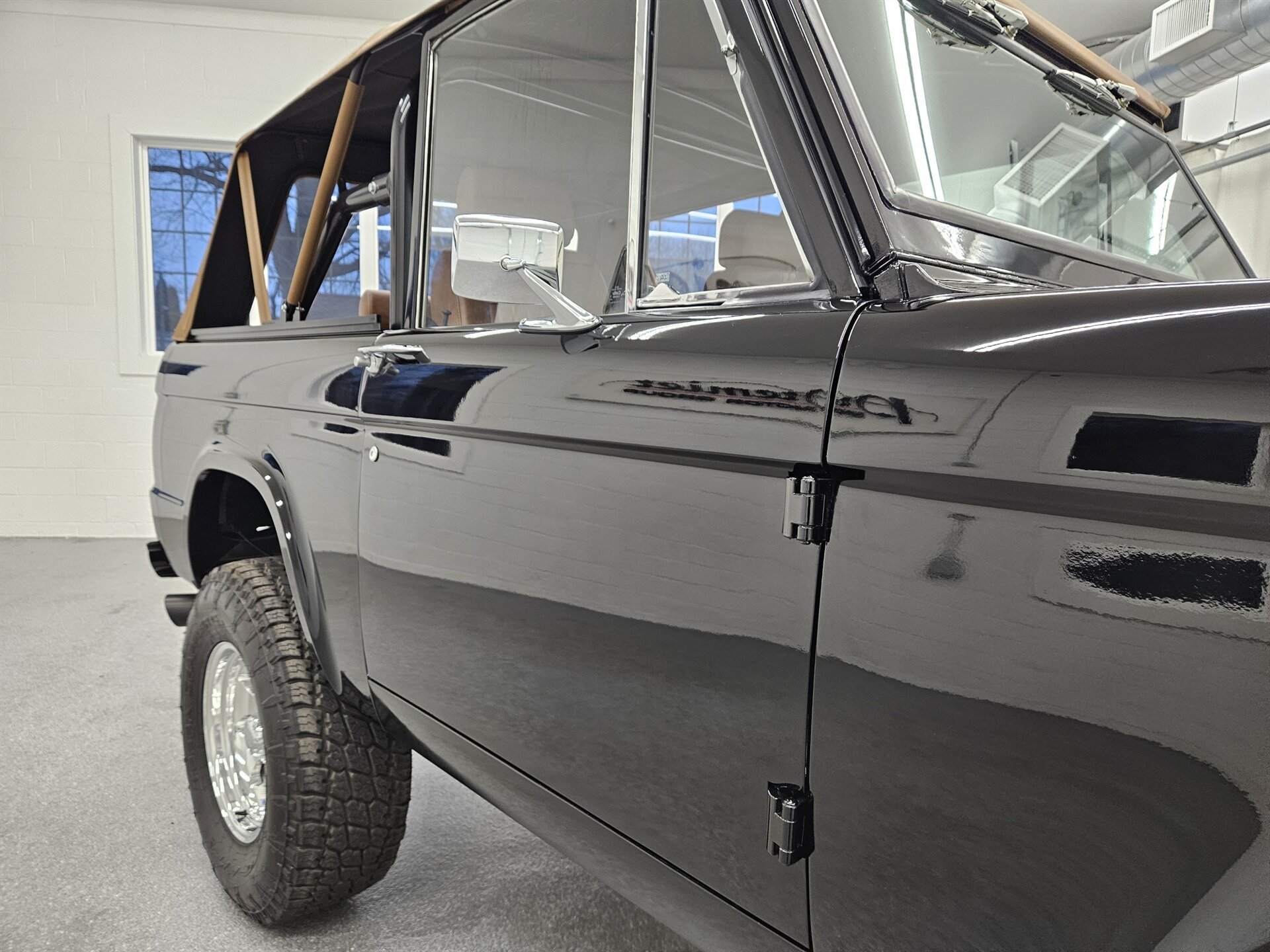 This 1969 Ford Bronco is a stunning marriage of classic aesthetics and modern performance, presented in a striking high-gloss black exterior over a deep walnut brown vinyl interior. Under the hood, the build is powered by a potent Blueprint 347 stroker engine featuring a Holley Sniper fuel injection system, paired with a C4 automatic transmission and a precision Sidewinder shifter. The cabin is thoughtfully appointed with a polished tilt steering column, a digital gauge display, and a premium saddle brown soft top. This Bronco commands a powerful presence on the road thanks to a 4-inch suspension lift with Bilstein shocks, sitting perfectly on 17-inch Ultra Wheels wrapped in aggressive all-terrain tires. Contact us to schedule your test drive today!