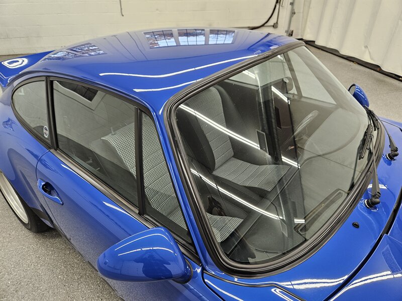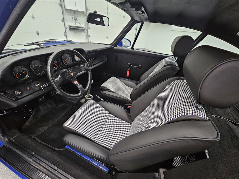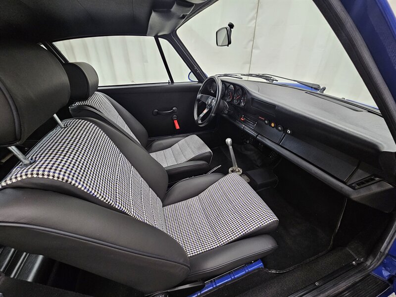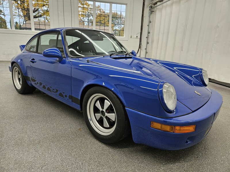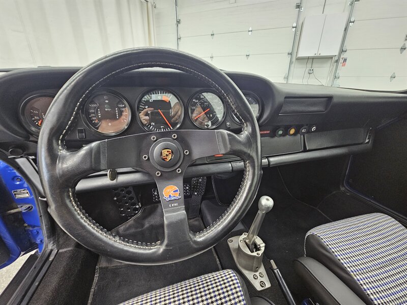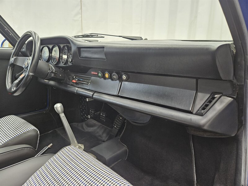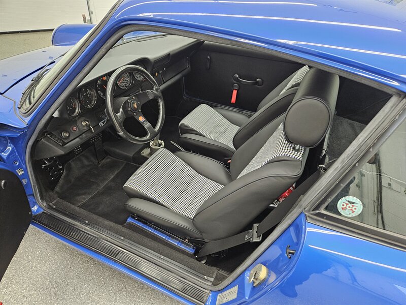 Offered for sale is a stunning 1974 Porsche 911 Coupe, professionally transformed into an RS-style tribute and finished in striking Nogaro Blue over black leather with classic houndstooth inserts. This meticulously executed build began in the early 2000s and features steel fender flares, RS-style bumpers, a fiberglass ducktail decklid, a full color change, and 993 “Aero” mirrors paired with H4 headlights for a clean, purposeful look.