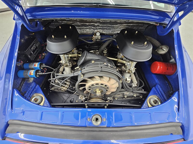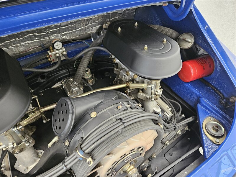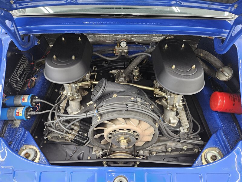 Power is delivered by a twin-plug 3.6L flat-six installed in 2003, fed by dual PMO carburetors and managed by an MSD Digital 6AL ignition system. A custom exhaust with headers and dual auxiliary oil coolers—mounted in the front valance and right front fender—ensure both performance and reliability. The engine is paired with a 915 five-speed manual transaxle that was comprehensively rebuilt in 2025, including new synchro rings, sleeves, and teeth, a resurfaced flywheel, a new clutch, a new differential pinion bearing, and a fresh rear main seal. The aluminum-case gearbox utilizes an 8.31:1 ring and pinion.