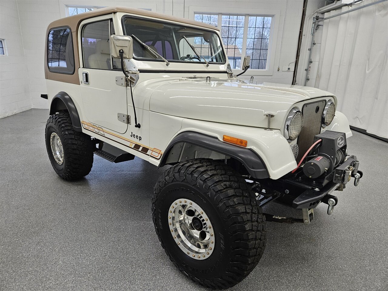 This 1986 Jeep CJ7 presents a stunning blend of classic styling and modern performance, finished in its original Olympic White exterior over a tan cloth interior featuring Renegade racing bucket seats. Power is supplied by a performance-oriented Summit Racing 350 V8 crate engine which has been further enhanced with a modern FI-Tech fuel injection system. This robust engine is paired with a rebuilt T4 manual transmission and a capable Dana 300 transfer case. The drivetrain is further optimized for off-road dominance with Detroit Lockers and 4.56 gears. Built for utility and rugged appeal, the Jeep features a 1-inch body lift to accommodate the 15" Mickey Thompson alloy wheels wrapped in the aggressive 35-inch BFGoodrich tires, a full roll cage for safety, a durable Smittybilt front bumper, and a functional Warn winch. This classic CJ7 offers a unique and powerful driving experience for any enthusiast. Call today to schedule a showing of the 1986 Jeep CJ7.