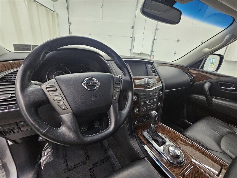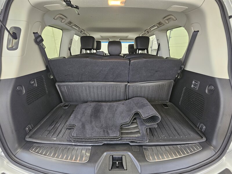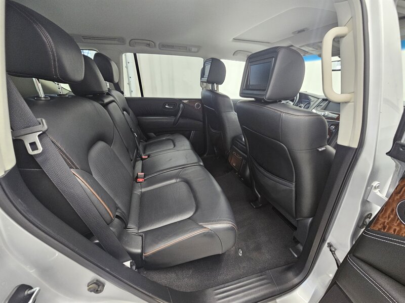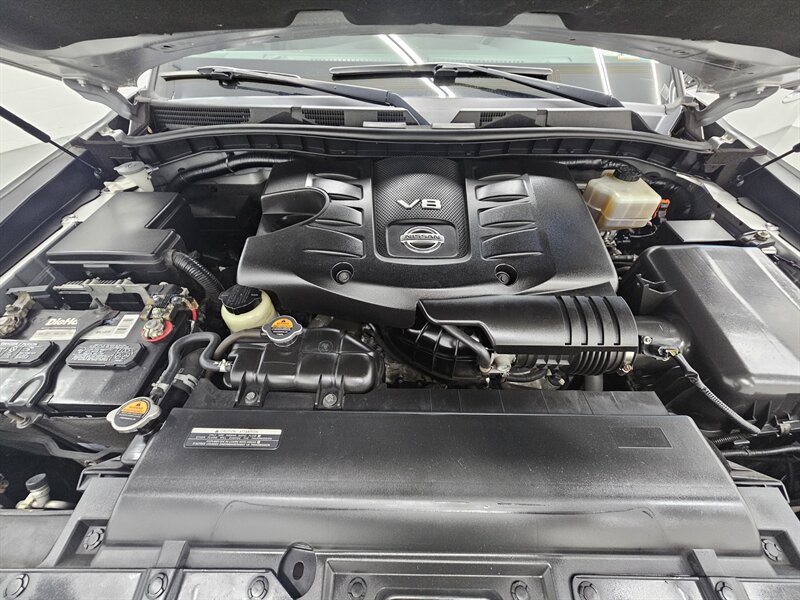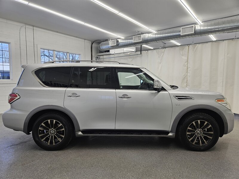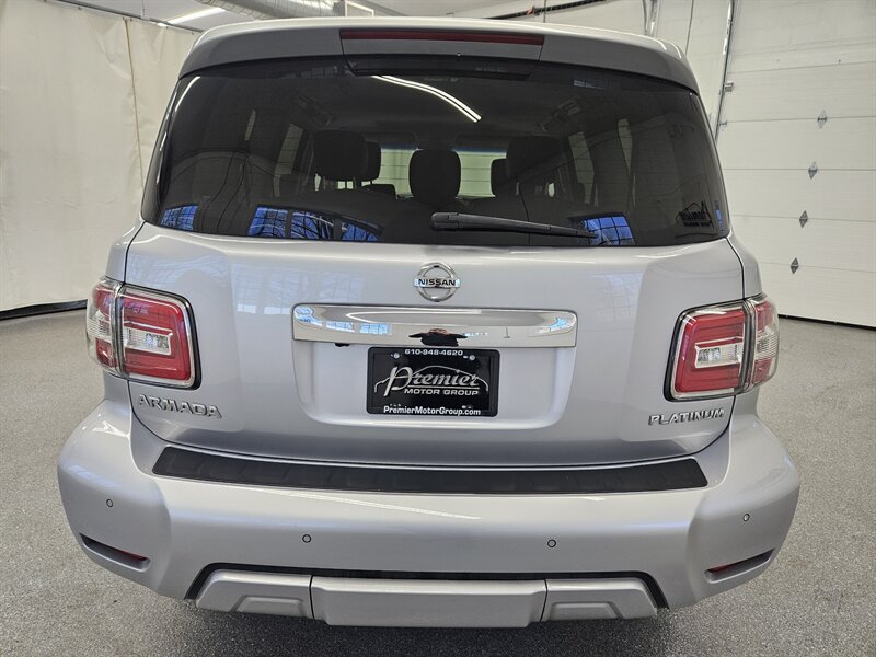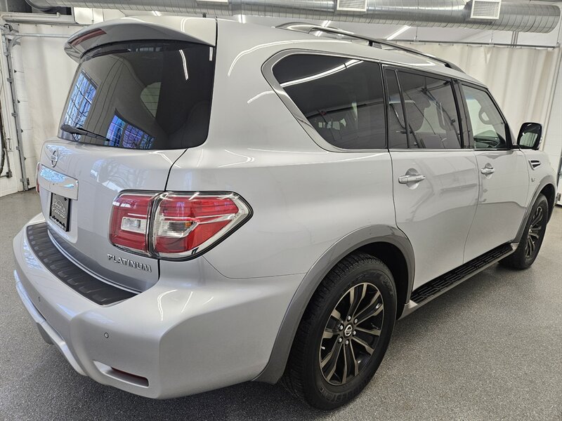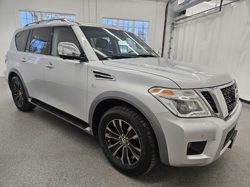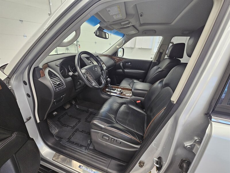 You are viewing a freshly serviced 2017 Nissan Armada Platinum that is now available for sale. This all-wheel-drive SUV is finished in a bright silver exterior complemented by a black leather interior. The top-of-the-line Platinum trim is exceptionally well equipped, featuring a powerful 5.6L V8 engine along with power windows, power locks, cruise control, power mirrors, and power seats. Luxury and comfort are enhanced with heated and cooled front seats, heated rear seats, rear-seat entertainment, and a power sunroof, while technology features include navigation, hands-free phone connectivity, parking sensors, a backup camera, and remote start. Additional highlights include hill assist, running boards, and stylish alloy wheels. The asking price also includes a 3-month/3,000-mile limited warranty. Call today to schedule your test drive.